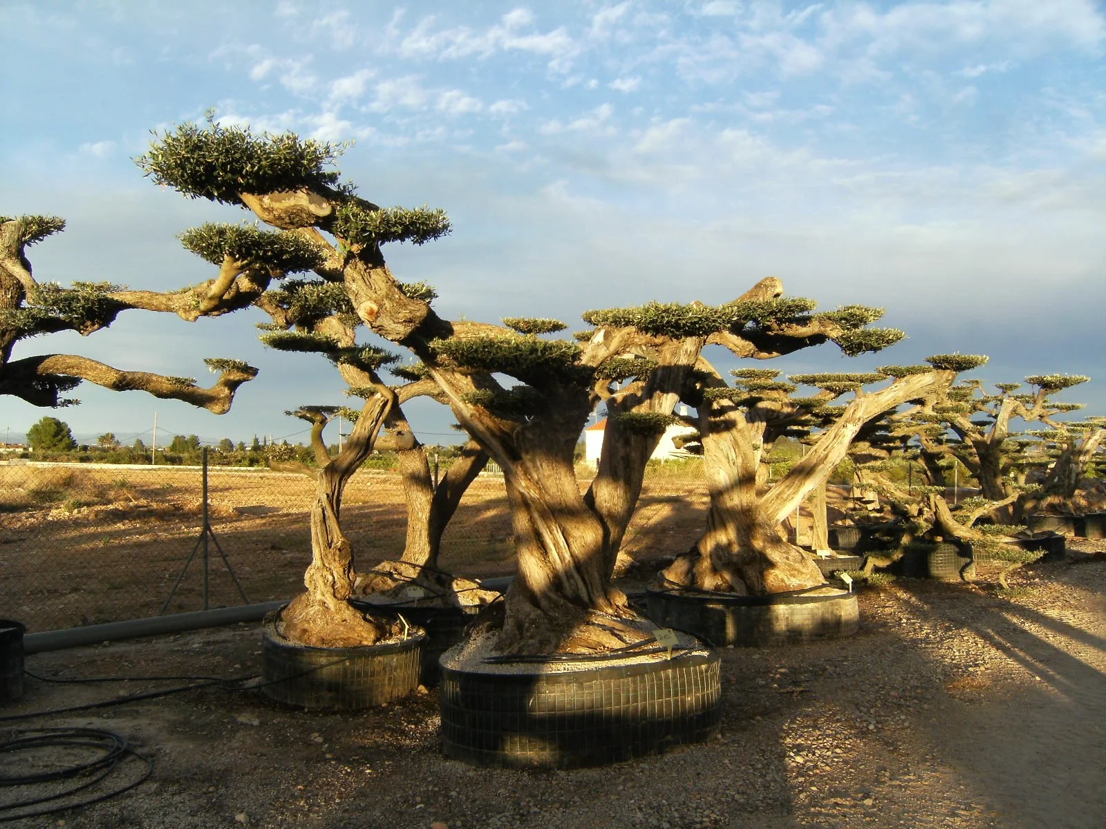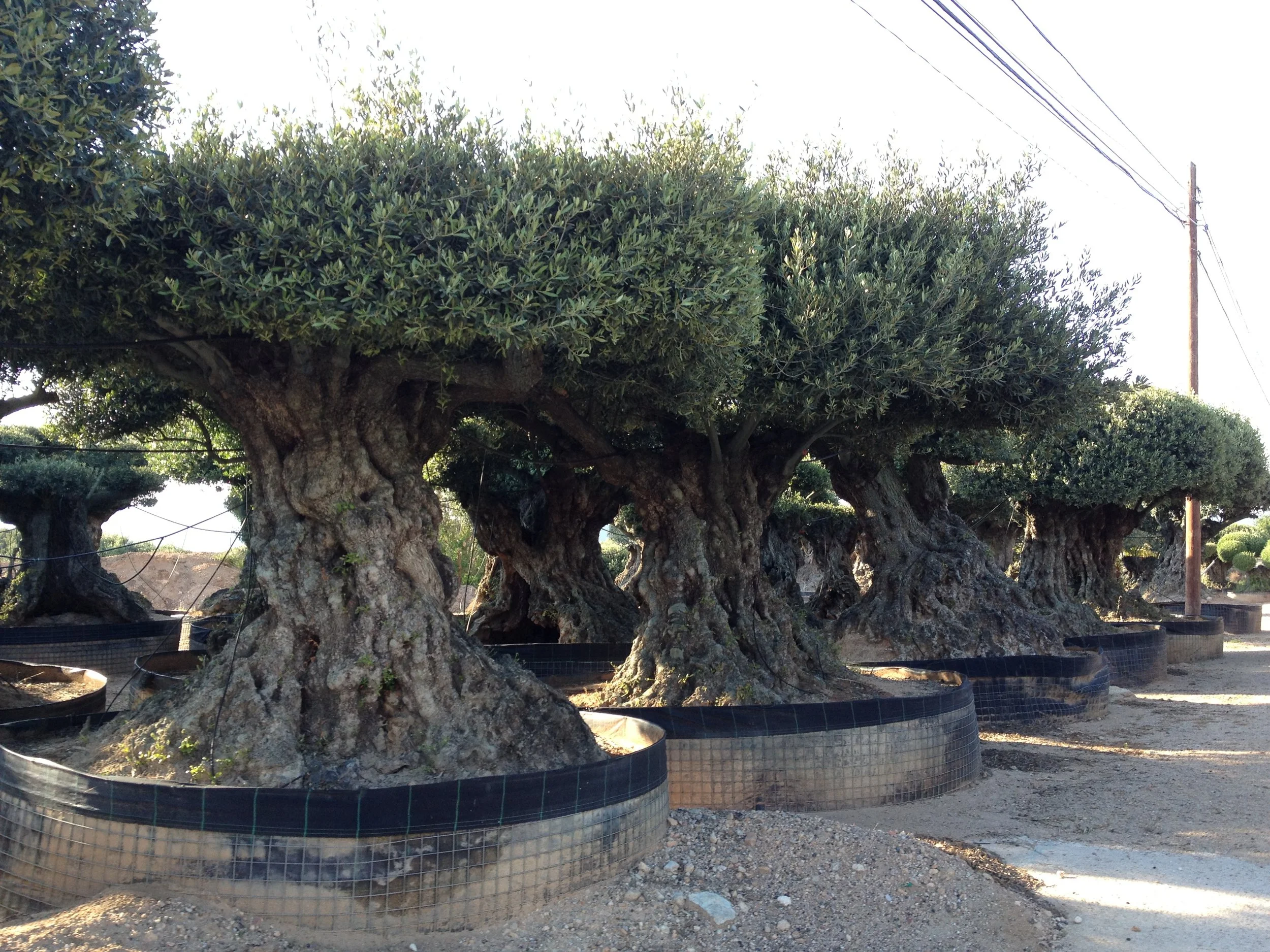 Árboles envejecidos en un vivero, con ramas recortadas y raíces protegidas con tela negra, bajo cielo despejado.